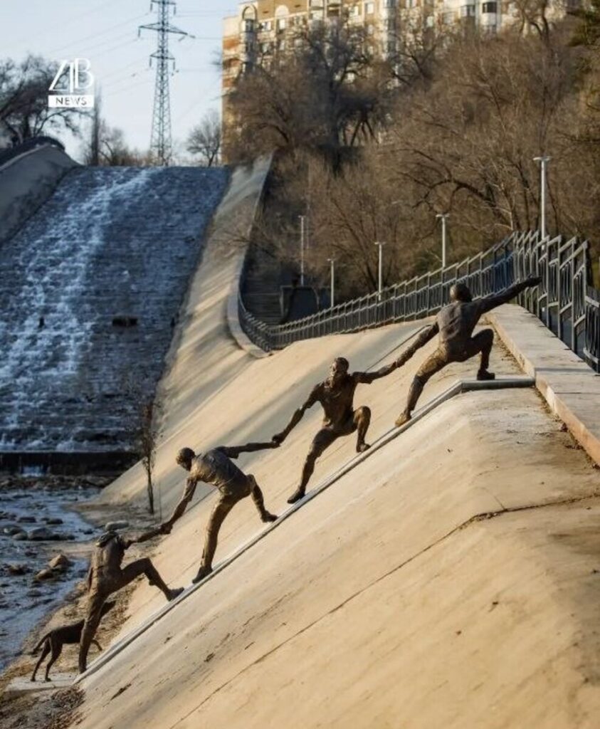 في حديقة سايران بمدينة ألماتي يقف عمل نحتي حديث صمّمه الفنان الكازاخي Erbossyn Meldibekov التمثال يصوّر سلسلة بشرية تتدلّى على جدار قناة مائية أيدٍ متشابكة وأجساد تتوازن فوق الفراغ في إعادة تشكيل دقيقة لحادثة واقعية حدثت عام 2016 حين تعاون مجموعة من الأشخاص لإنقاذ كلب عالق في القناة.