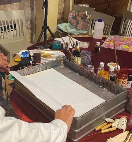 8- إذا كانت هناك تجاعيد على الورقة نقوم بكويها بحرارة متوسطة ونضع قطعة من القماش الأبيض عليها ثم نمرر عليها المكواة، ويضاف إليها سائل الكيترة والماء لتهيئة للرسم بها.