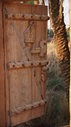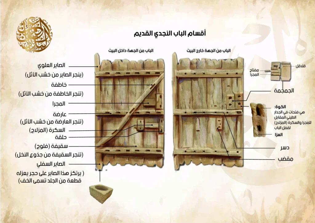 لم ينبع جمال الباب النجدي من صدقه فهو يُصنَّع من خامات محلية كجذوع النخل والأثل التي تُقطع إلى شرائح (الفلوج) وتُصفّ بدقة على ثلاث عوارض هذا الحوار بين الخشب والطين يخلق انسجاماً يجعل الباب جزءاً عضوياً من البناء.