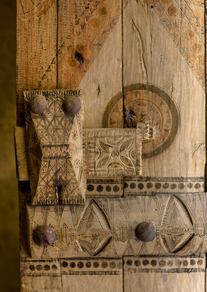 لا مكان للعفوية في فن الأبواب النجدية فالبساطة هنا مُتقَنة ومحسوبة تعتمد الزخرفة على لغة الكون الأساسية من مثلثات ومربعات ودوائر وخطوط متقاطعة، لتشكل نسيجاً زخرفياً متماسكاً لكن القلب النجدي المتصل بالطبيعة يضيف لمسات من سعف النخيل والأوراق وعناقيد العنب المستوحاة من بيئته المحيطة.